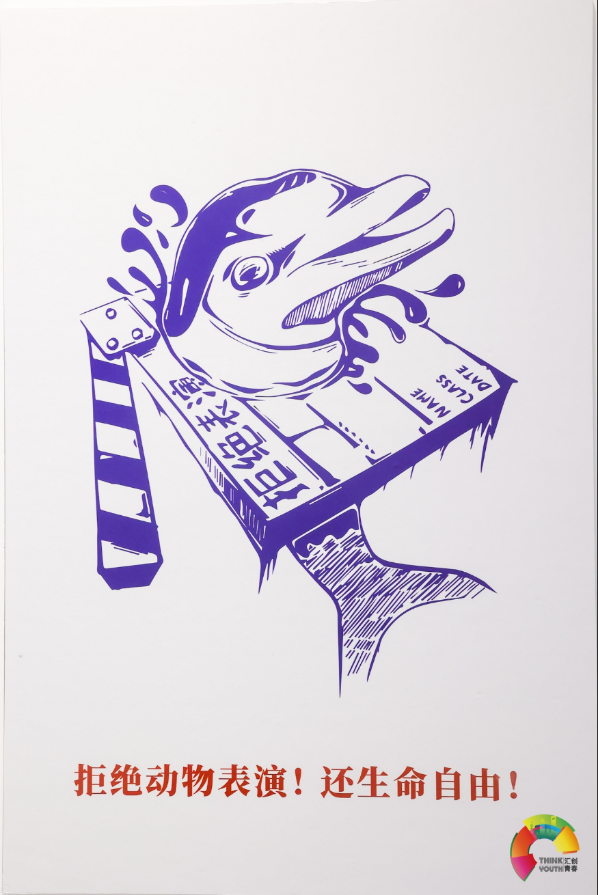 设计说明:现在的水族馆中仍有很多动物在表演,海豚就是其中的代表,招贴以打板器中困住的海豚为设计构思,以手绘的形式生动表现了海豚由于表演失去了自由,呼吁拒绝动物表演,还生命自由!