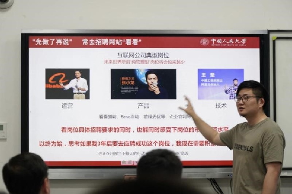 黄旭峰介绍了互联网公司的典型岗位以及在未来职场可能最常见的三种人,建议同学们可以常去招聘网站看看,以网站上发布的岗位信息为“终点”倒逼自己从现在开始要学习和准备什么,在实践中不断尝试让自己努力成为具有横向跨界思维和纵向专业深度的“T”型人才。