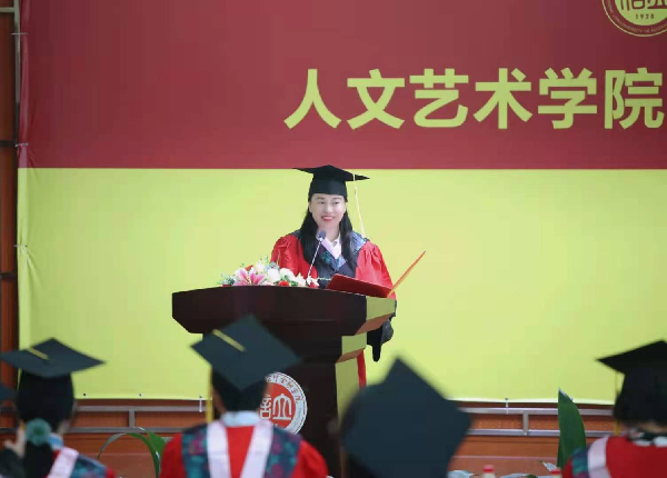 毕业生代表朱牧发言,回忆了大学四年的点滴成长,表达了对母校的深厚感情,感恩学校师长以及教辅人员的培养和教育。同时,毕业生代表向教师代表、辅导员、教辅代表、后勤保障代表献花。