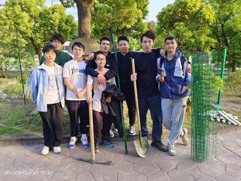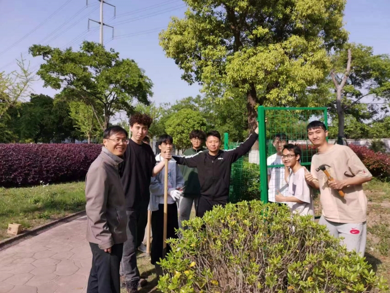 同学们互相合作,共同劳动,在宿舍楼附近的花园种植花草,树立栅栏来打造出适宜环境给校园绿化植物提供生长空间。