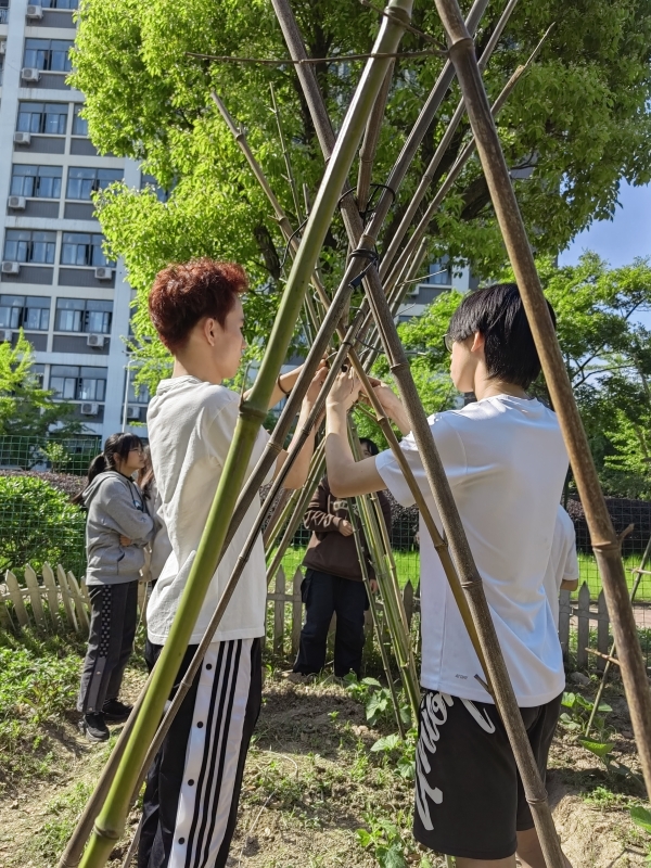 预科生谭庆婷:今天下午我跟随老师们的步伐走进了那片菜园,通过我们自己的努力,让西红柿秧苗的周围有了支架。感谢学校给了我们这样一个锻炼自我的实践机会,当我在切身体验劳动时,我才更进一步地融会了“劳动光荣”这句话的精髓。