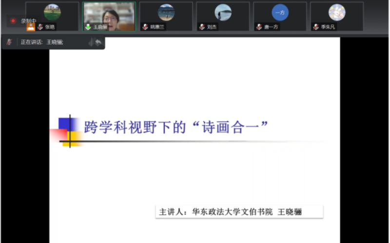 2023年6月14日晚,华东政法大学文伯书院院长王晓骊教授应邀为我院师生开展题为“跨学科视野下的‘诗画合一’”的学术讲座,讲座由人文艺术学院党总支副书记、院长姚惠兰主持,学院师生参加了此次讲座。