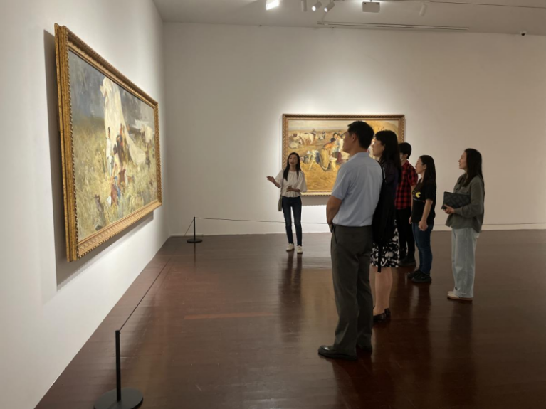 此次展览聚焦于新中国美术的“青年”时代,展览中的作品充满了青春的记忆,立体地呈现出新中国美术的青春状态,唤起人们对过往年代的追忆与思考。参观过程中,学院艺术教学部副主任陶绮骋为大家讲解了詹建俊先生的油画《起家》,为了创作,作者深入北大荒进行考察,用现实主义的手法将年轻人开拓荒原的场面描绘得栩栩如生,画面充满了战斗激情与活力。还有,林岗的《群英会上的赵桂兰》、蔡亮的《情意深》、贾又福的《更喜岷山千里雪》、以及闻立鹏的《国际歌》等作品,都具有鲜明的时代精神与特色。在欣赏和品阅新中国成立后的部分美术作品的过程中,党员们感受到人民生活发生的翻天覆地的变化。