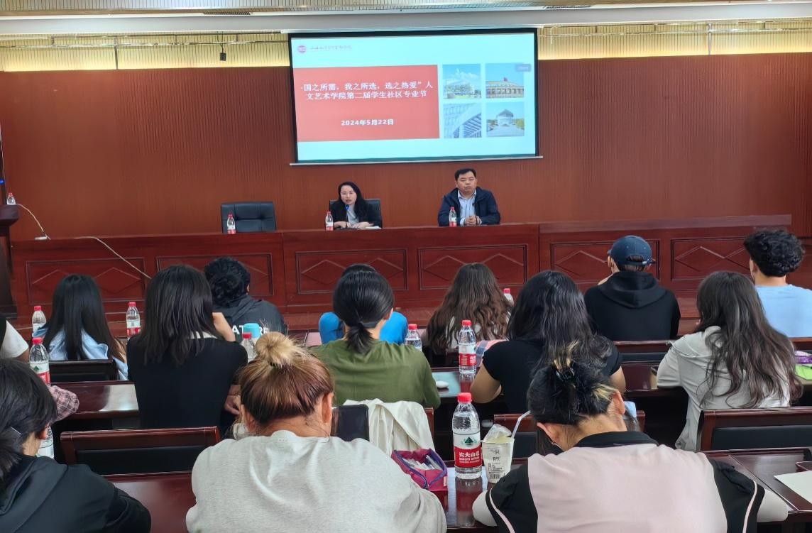 为全方位多维度引导预科学生建立专业意识,提高专业选择有效度,5月22日,人文艺术学院在上川路校区实验中心201举行少数民族预科生“国之所需,我之所选,选之热爱”第二届学生社区专业节,活动人文艺术学院党总支副书记、副院长陈嵩莉,校招生办彭朋,党委学生工作部阿力木江·伊斯力以及2023级少数民族预科全体学生参加。活动由人文艺术学院党总支副书记、副院长陈嵩莉主持。