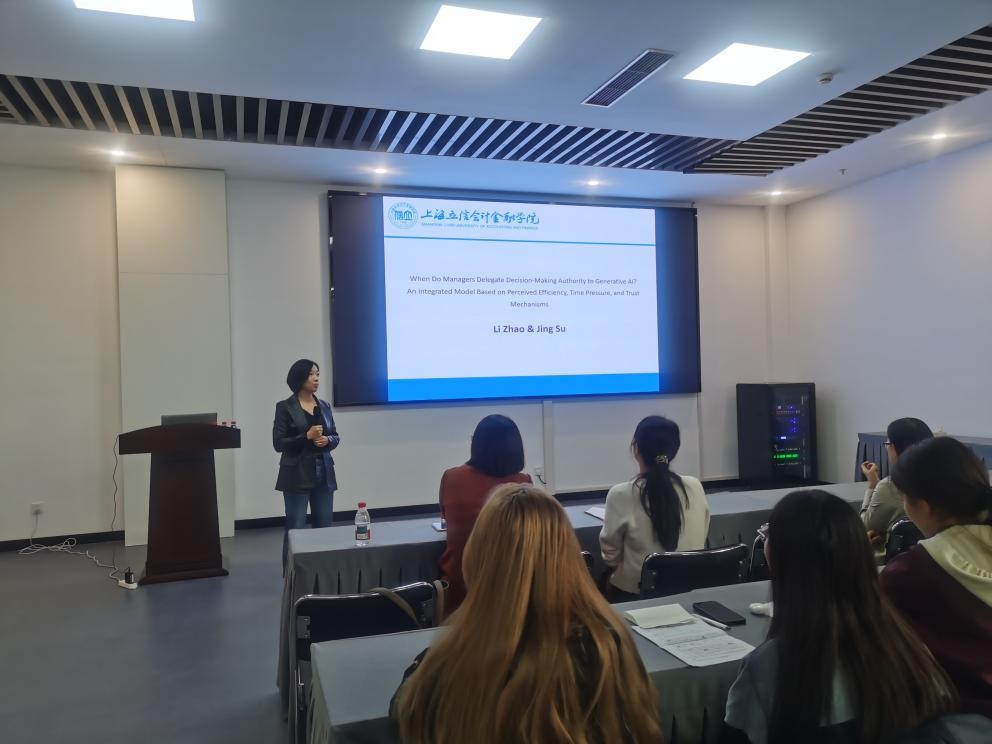 工商管理学院苏靖围绕“When Do Managers Delegate Decision-Making Authority to Generative AI? An Integrated Model Based on Perceived Efficiency, Time Pressure, and Trust Mechanisms”主题进行分享,深入剖析管理者向生成式人工智能(GAI)授权决策的心理机制与情境约束因素。基于企业管理者的问卷调查数据,苏老师团队构建了涵盖感知效率、信任与时间压力的整合分析模型。研究得出三项关键结论:一是管理者对GAI的感知效率,对其授权意愿具有显著正向影响;二是信任在感知效率与授权意愿之间发挥部分中介作用,即高效感知需通过信任转化为授权行为;三是时间压力兼具直接与调节效应,不仅会直接削弱管理者对GAI的信任水平,还会负向调节信任对授权意愿的积极影响——在高时间压力情境下,信任对授权意愿的提升作用显著减弱。该研究揭示了效率驱动型理性信任在GAI授权中的核心地位,同时凸显时间压力作为关键情境变量的约束作用,为企业优化人机协作策略、提升管理效率提供了重要理论启示。