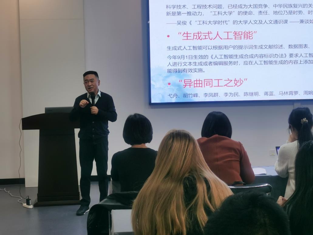 人文艺术学院杨青泉以“人类写作的恒量与变量:人工智能背景下高校文学类学科发展趋势展望”为题,从人文视角解读AI与写作、文学的交叉融合。杨老师系统梳理了从印刷文化到数字文化的演进历程中,人类写作活动的本质特征与时代变迁,结合高校文学学科与写作学科的发展历史及现状,深入剖析了写作学、文艺学等领域关于创作主体研究的不同理论路径。在此基础上,杨老师围绕AI技术普及背景下,高校文学类学科如何坚守人文内核、创新人才培养模式、拓展研究方向等核心问题提出前瞻性思考,为文学类学科的高质量发展提供了新视角。