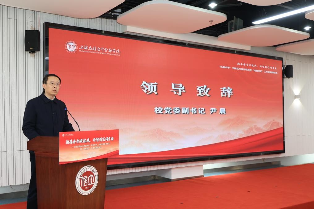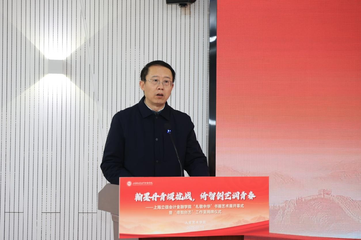 尹晨在致辞中指出,党的二十届四中全会明确提出要“发展具有强大思想引领力、精神凝聚力、价值感召力、国际影响力的新时代中国特色社会主义文化,扎实推进文化强国建设”,特别提出要“用好红色资源,加强青少年理想信念教育”。此次活动以书画为媒回望烽火岁月,既是对伟大抗战精神的致敬传承,也是落实文化育人要求的生动实践。他回顾了立信深厚的文化育人传统,从1936年开办的音乐训练班汇聚冼星海、吕骥等革命音乐家,诞生《黄河大合唱》《大刀进行曲》等经典抗战作品,到2013年首演、2025年复排的大师剧《潘序伦》,再到学校交响乐团、星海艺术团在全国大学生艺术展演中斩获的多项一等奖,以及书画协会成员超300人次在各级赛事中获奖的佳绩,充分彰显了学校文化育人的丰硕成果。‘