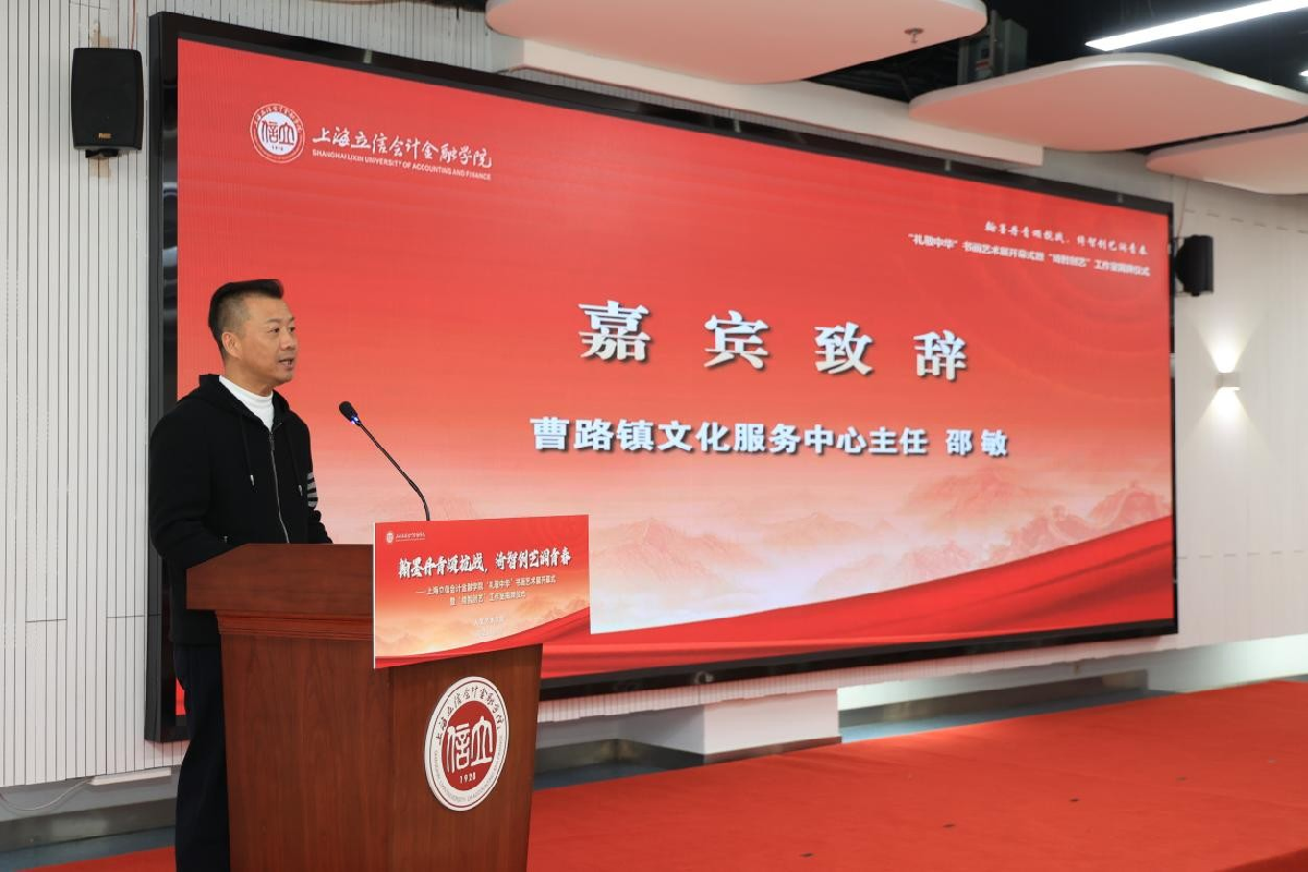 邵敏代表曹路镇文化服务中心致辞,他表示上海立信会计金融学院与曹路镇已联合举办多次书画展,此次合作是校地文化共建的持续深化。未来曹路镇将继续整合优质资源,为学子提供更多文化实践机会,共同培育兼具文化素养与创新活力的时代青年。