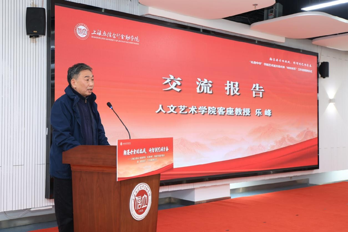 我校书法教育引领者人文艺术学院客座教授乐峰作交流报告。他结合多年从事书画艺术实践和教育的经历,从书法艺术的文化内涵、抗战主题的艺术表达等方面分享感悟,鼓励青年学子以笔墨为媒,传承红色基因,用艺术创作讲好中国故事。