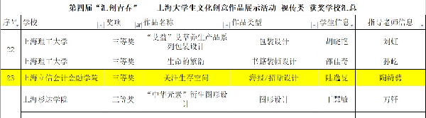 近日,第四届“汇创青春”——上海大学生文化创意作品展示活动(视觉传达设计类)作品开幕式在松江美术馆举行,获奖结果揭晓,我院教师陶绮骋指导的学生参赛作品再获佳绩。