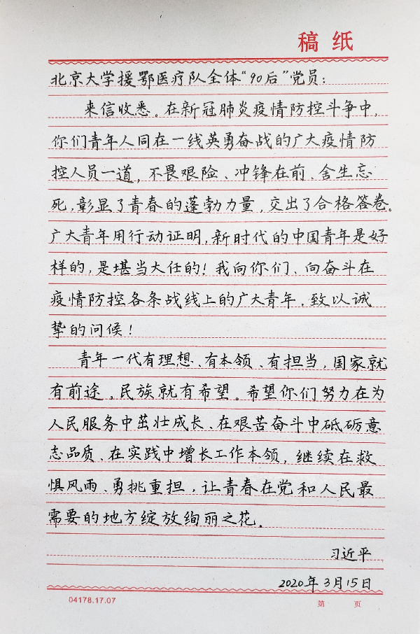 中共中央总书记、国家主席、中央军委主席习近平于3月15日给北京大学援鄂医疗队全体“90后”党员回信,向他们和奋斗在疫情防控各条战线上的广大青年致以诚挚的问候。总书记暖心的话语,深深地鼓舞着每一个人文学子。