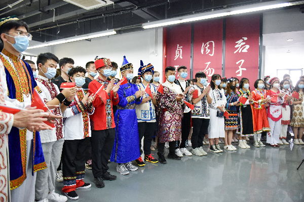 田磊认为本次展览通过展示少数民族学生和汉族学生的书法、绘画、摄影作品,讴歌、礼赞、庆祝中华人民共和国七十一周年华诞,是民族团结教育、爱国主义教育和中华优秀传统文化传承的融合,同时展现出学校在结合“一体一艺”特色、培养高水平财经类人才方面取得的突出成绩。人文艺术学院党总支书记黄敏回顾了本次展览的筹备过程。参展学生代表康梦琪、阿艺佳分享了备展心得。开幕式在全体师生深情高歌《我爱你,中国》中落下帷幕。