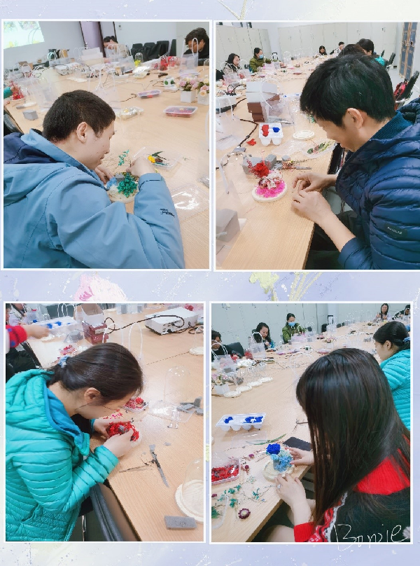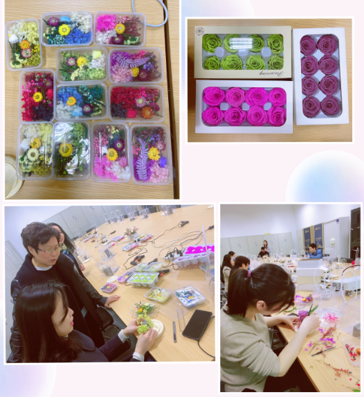 花艺制作老师在现场演示了制作永生花的技巧与方法,并详细介绍了永生花的来源和知识,鼓励教职工们发挥个人的艺术天分,制作独一无二的永生花。在老师的指导下,大家从措手不及到每位教职工都制作出了属于自己的永生花,活动现场欢声笑语,气氛温和而飘香四溢。